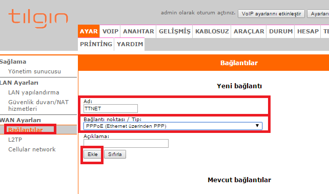 Tılgın Modem Yeni Bağlantı